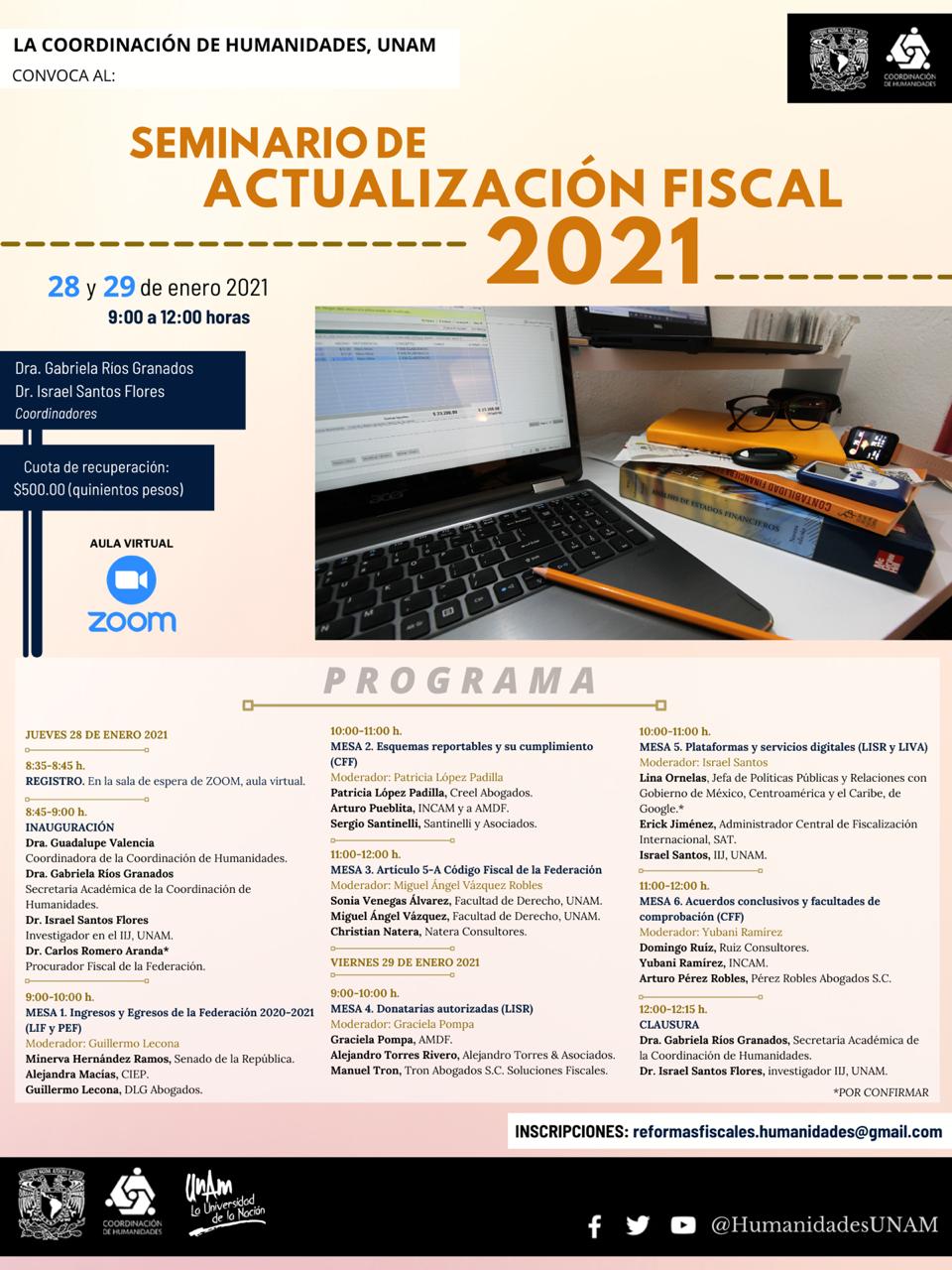 Aquellos interesados en el Seminario de Actualización Fiscal 2021 pueden encontrar información a continuación o consultar el sitio humanidades.unam.mx/.